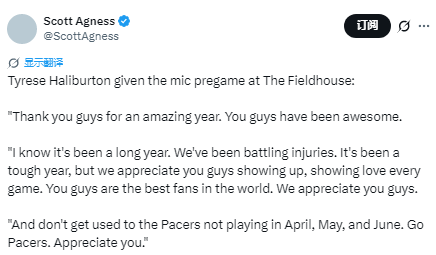 哈利伯顿说道:“感谢大家陪伴我们度过这不可思议的一年,你们一直都超棒。我知道这一年很漫长,我们一直在和伤病作斗争,这一年很艰难,但我们真心感谢你们每场比赛都到场支持、为我们呐喊。你们是世界上最好的球迷,我们由衷感激。”