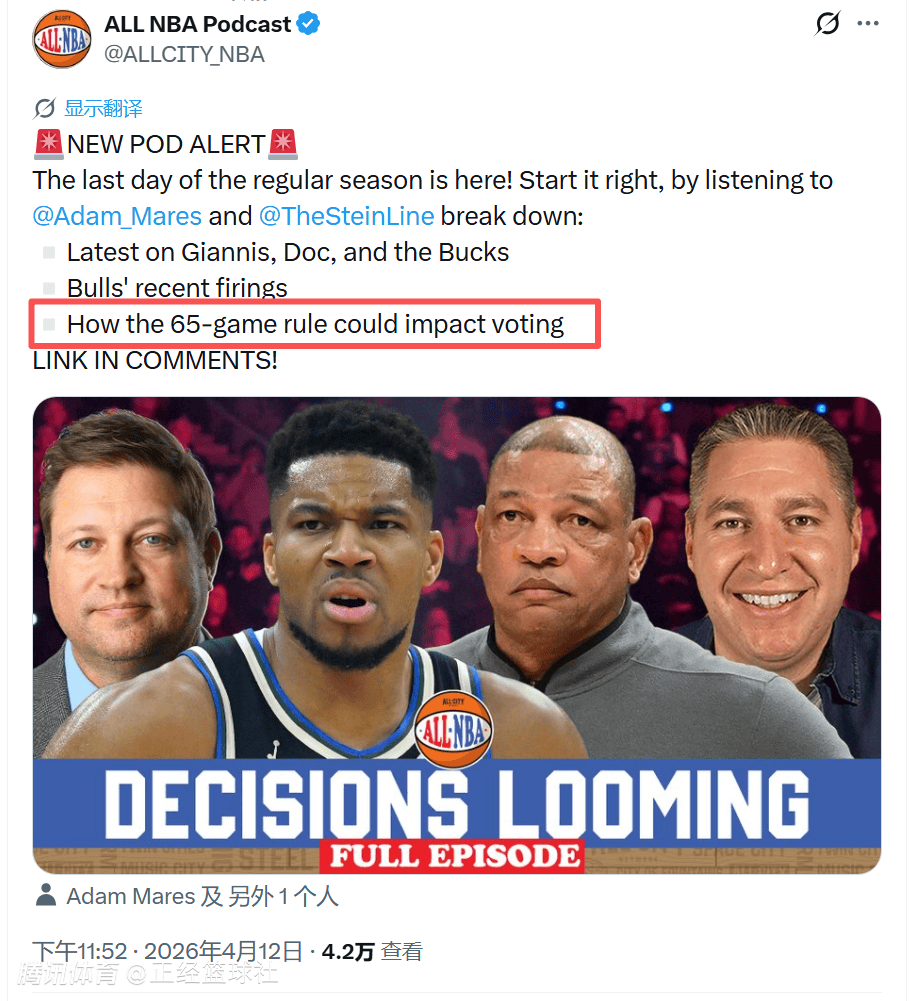 2026-04-13 07:10北京时间4月13日,NBA常规赛继续进行。据知名记者Mac Stein报道,NBA总裁亚当-肖华在上一次联盟董事会会议上,明确叫停了所有关于修改“65场规则”的提议,坚定维护这项现行评奖门槛规则。