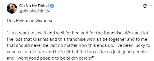 在谈到字母哥时,里弗斯表示:“我真心希望他和这支球队都能有好的结果,他们配得上这一切。我们不能忘记,字母哥和这支球队一起拿过总冠军,在我看来,这一点无论如何都不该被遗忘。字母哥为人非常出色,我有幸执教过很多球星,单论人品,他绝对是顶尖的。我希望好人都能被善待。”