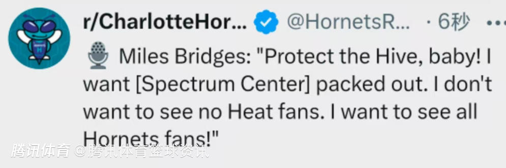 布里奇斯:守护我们的主场!我希望球馆座无虚席,不想看到任何热火球迷,只想看到全是黄蜂球迷。