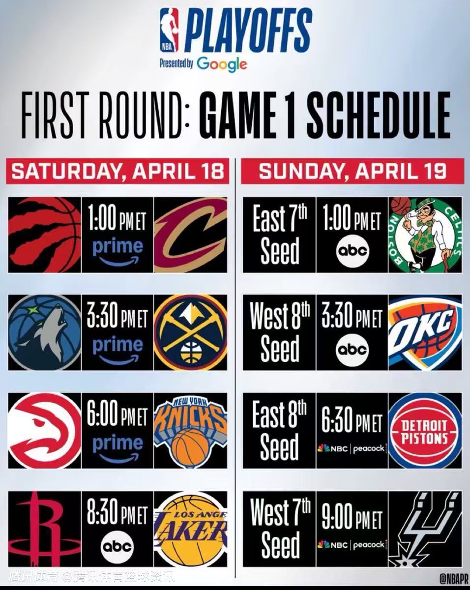 4月20日凌晨1点,凯尔特人队将对决东部7号种子(76人或魔术),雷霆队将在3点30分迎战西部8号种子(西部7/8名附加赛负者与9/10名附加赛胜者对决,胜者为8号种子)。活塞队在6点30分对阵东部8号种子(东部7/8名附加赛负者与9/10名附加赛胜者对决,胜者为8号种子),马刺队在上午9点对阵西部7号种子(太阳或开拓者)。