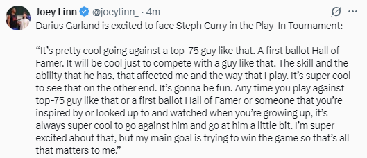 在谈到能对决库里时,加兰表示:“能和这样一位75大巨星、毫无悬念会首轮入选名人堂的人交手,真的很酷。能和这样的球员同场竞技,感觉很棒。他所拥有的技术和能力,深刻影响了我以及我的打球方式。能在场上和他对位,感觉特别棒,这会很有趣。每当你有机会和这样的巨星交手,或是和你成长过程中受到鼓舞、一直仰望并观看他比赛的球员对抗时,这种感觉总是特别棒。我对此超级兴奋,但我的主要目标还是赢下比赛,这对我来说才是最重要的。”