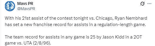 此外,小内姆布哈德还创造了独行侠新秀球员单场助攻新高纪录,原纪录同样属于基德,他曾在1995年3月13日对阵勇士队的比赛中曾单场送出17次助攻。