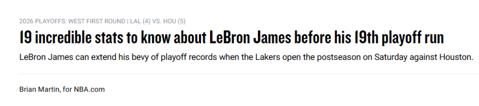 第19次季后赛!官网19项数据致敬詹姆斯:体育史上最伟大球员之一