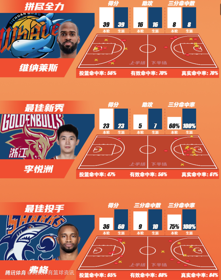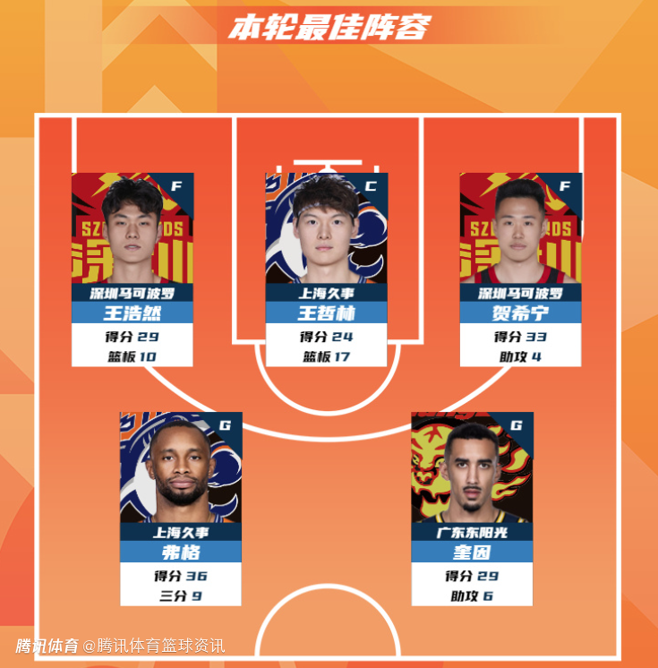 最佳阵容方面,来自广东男篮的奎因(29分6助攻)、深圳男篮的王浩然(29分10篮板)和贺希宁(33分4助攻)、上海男篮的王哲林(24分17篮板)和弗格(36分)携手入选。