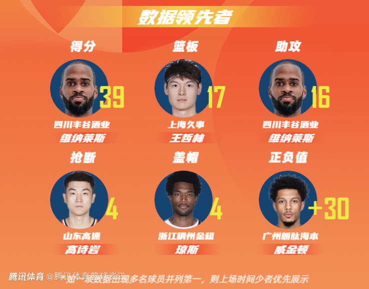 四川男篮球员维纳莱斯以单场39分的数据领衔得分榜; 上海男篮球员王哲林以单场17个篮板的数据领衔篮板榜; 四川男篮球员维纳莱斯以单场16次助攻领跑助攻榜; 山东男篮球员高诗岩以单场4次抢断的数据领衔抢断榜; 浙江男篮球员琼斯以单场4次封盖的数据领跑盖帽榜; 广州男篮球员威金顿以+30的正负值领先。
