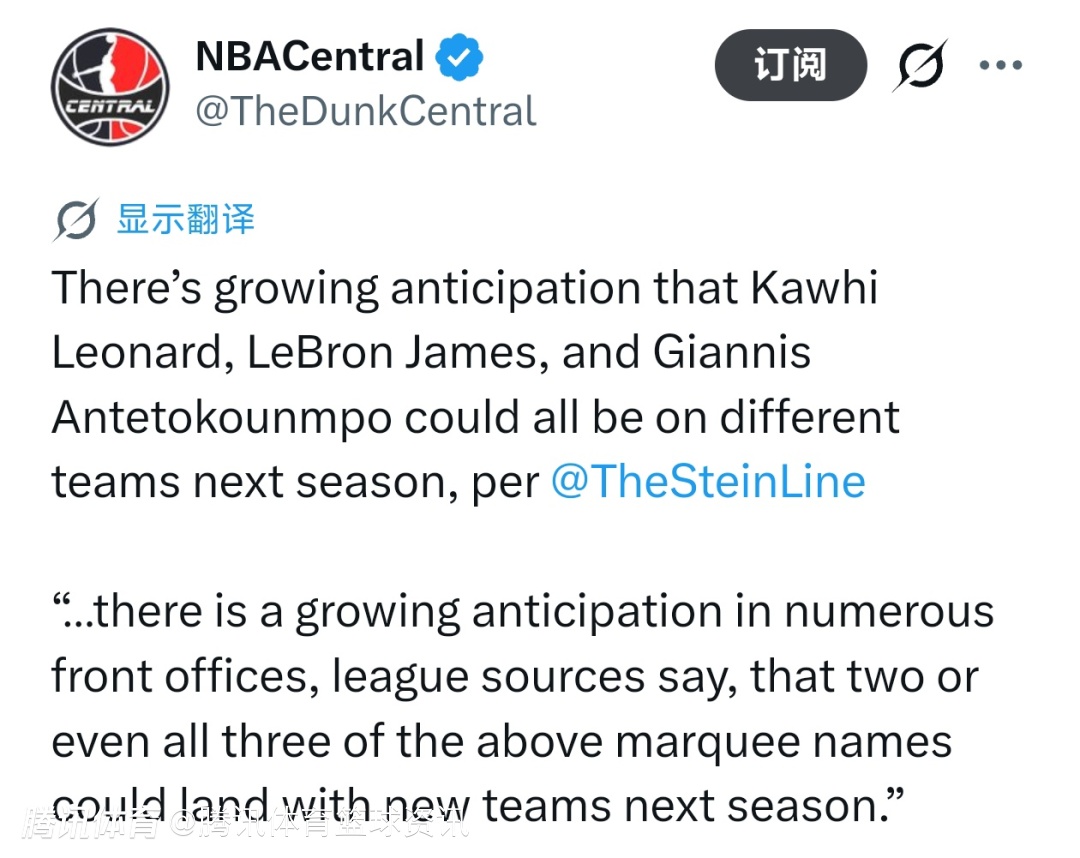 Stein表示:“多位联盟消息人士透露,越来越多管理层预判,上述三位顶级球星中,至少两人、甚至全部三人,下赛季都可能加盟新球队。”