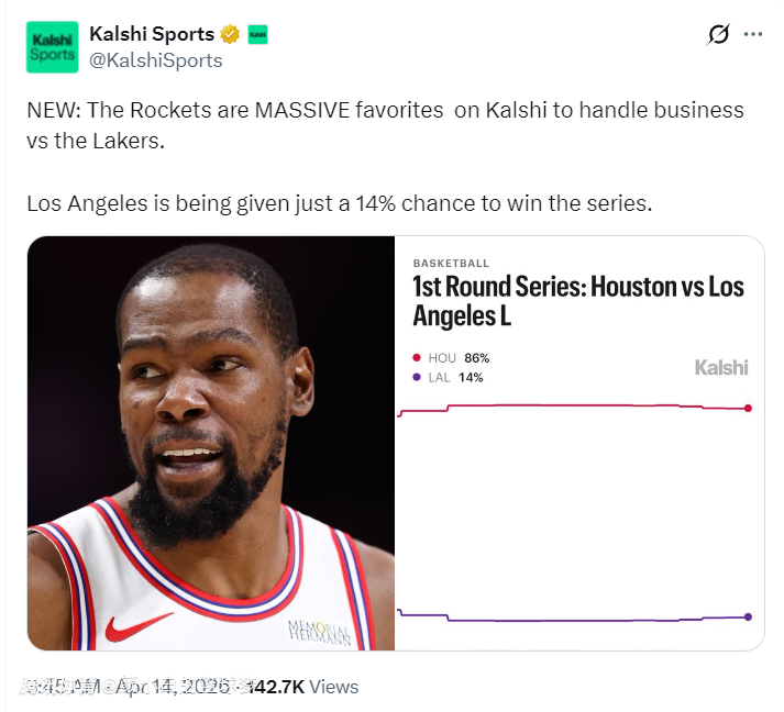 北京时间4月14日,根据数据媒体Kalshi Sports的分析,火箭淘汰湖人的概率高达86%,换言之火箭晋级次轮的概率86%。实际上这不仅仅是伤病的影响,就算东契奇、里夫斯能快些复出他们也没有100%的水准,再退一步就算东契奇、里夫斯有100%的水准他们千疮百孔的防守能力在季后赛会更加放大。