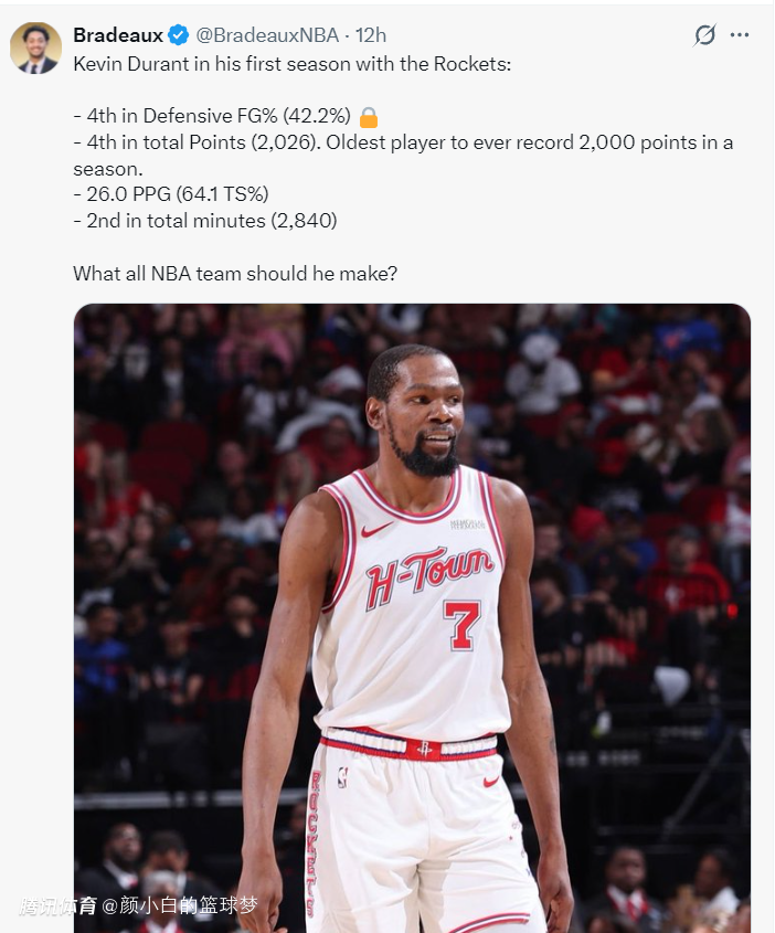 火记还晒出了杜兰特的数据作为佐证,杜兰特在加盟火箭的第一个赛季,防守对手命中率42.2%联盟第四,总得分2026分联盟第四,是史上单赛季达成2000分最年长的球员,场均26分真实命中率64.1%,总登场时间2840分钟联盟第二。