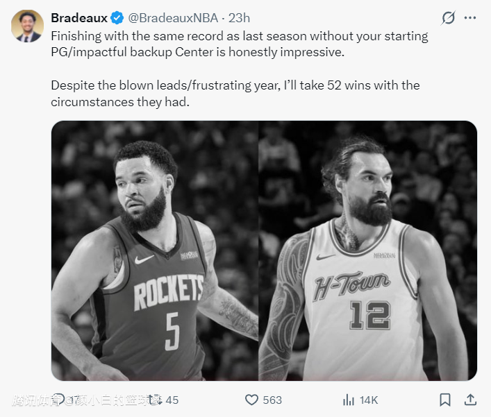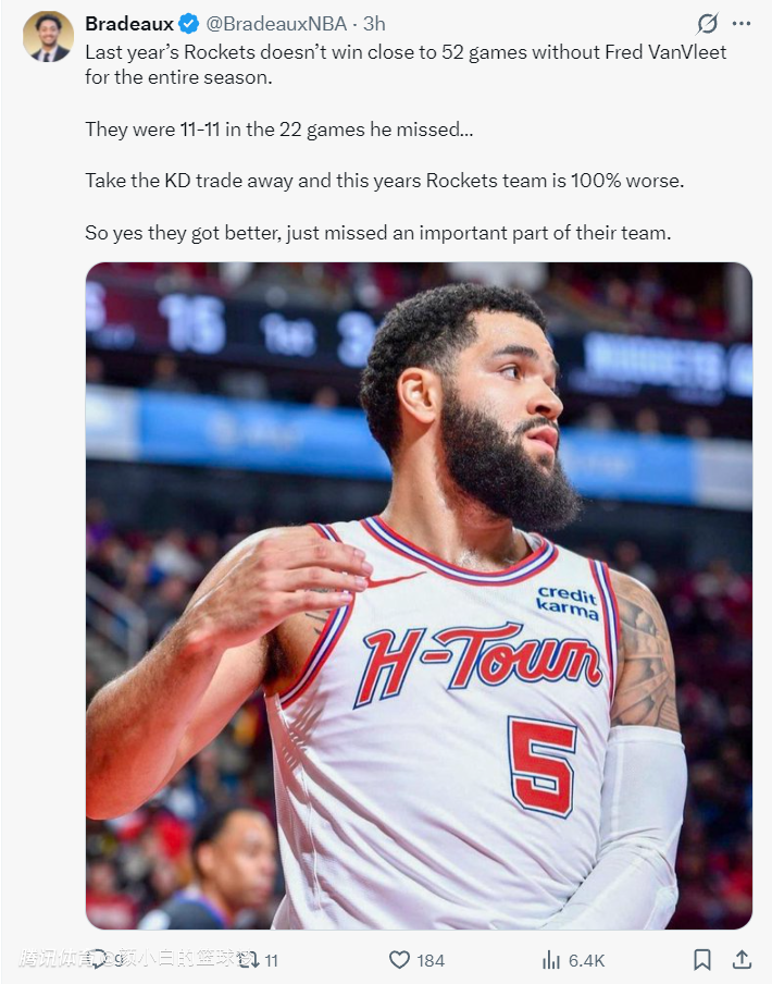 火箭记者Bradeaux写道:去年那支火箭没有范弗利特不可能拿52胜,在去年他缺席的22场比赛中火箭11胜11负。如果火箭队没能换来杜兰特,今年的火箭实力会下降100%,所以火箭是进步了,只是缺少了重要的成员。