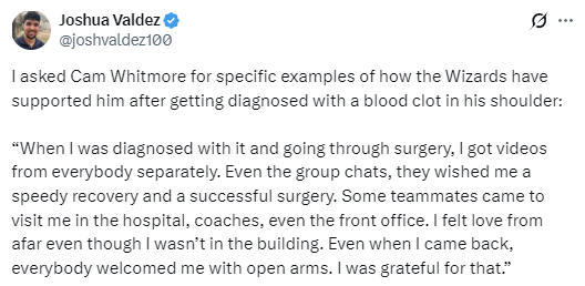2026-04-14 12:20北京时间4月14日,奇才队举行新闻发布会,惠特莫尔接受媒体采访,透露导致自己赛季报销的右肩深静脉血栓甚至让他的生命有危险。