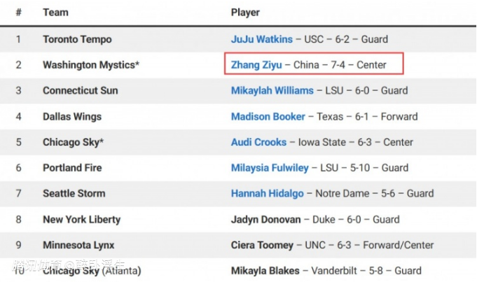 中国巨人!张子宇2027年将获WNBA选秀资格 知名网站预测成榜眼