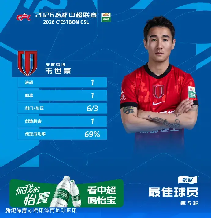 2026-04-14 21:20北京时间4月14日,中超联赛官方宣布,韦世豪 凭借关键表现,当选2026赛季中超第5轮最佳球员。