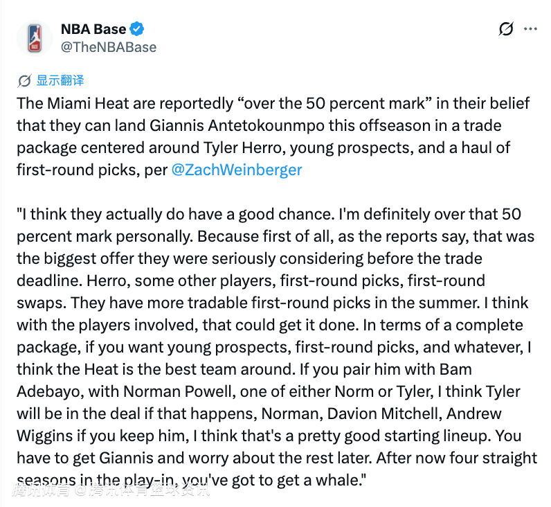 2026-04-15 01:00北京时间4月15日,据热火队记据扎克-温伯格报道,迈阿密热火有超过50%的把握,能在今年休赛期通过以希罗为核心,搭配年轻潜力股和大量首轮签的交易报价,拿下字母哥。