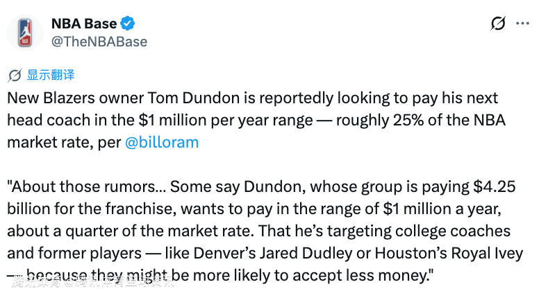 Bill Oram表示:“关于这些传闻……有人说,邓顿的财团花了42.5亿美元买下球队,却只想给主教练开年薪100万左右,大概是市场价的四分之一。他的目标人选是大学教练和前球员,比如掘金的杜德利、火箭的艾维,因为这些人更有可能接受低薪。”