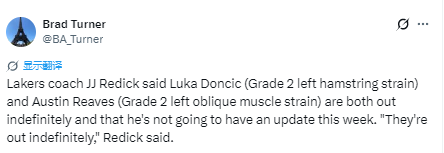 雷迪克表示,东契奇(左腿筋二级拉伤)与里夫斯(左腹斜肌二级拉伤)均无限期缺阵,且他本周不会公布两人的最新恢复进展。