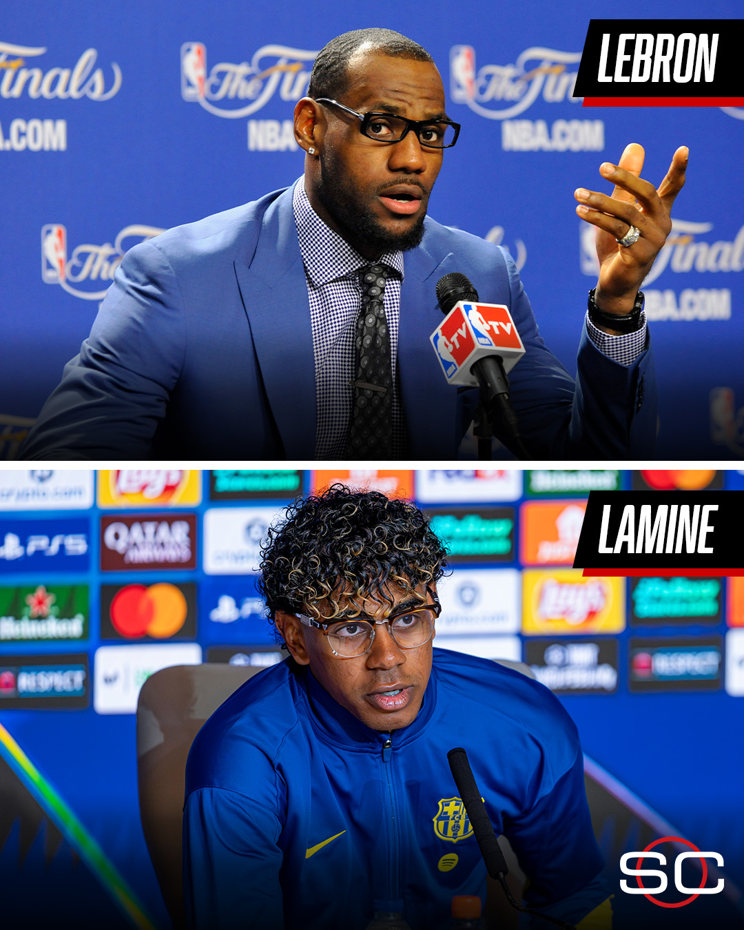 在本场比赛前,亚马尔做出了一系列举动效仿和致敬2016年NBA总决赛率领骑士逆转勇士夺冠的詹姆斯。