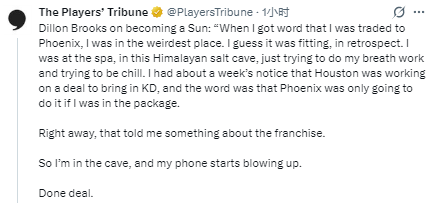 狄龙说道:“得知自己被交易到太阳时,我正处在一个很奇妙的地方。现在回想起来,倒也挺应景的。我当时在水疗馆的喜马拉雅盐洞里,正在做呼吸练习,努力让自己放松下来。一周前我就收到消息,火箭正在努力追求杜兰特,而传言称,太阳方面只有把我加入交易筹码,才会同意这笔交易。”