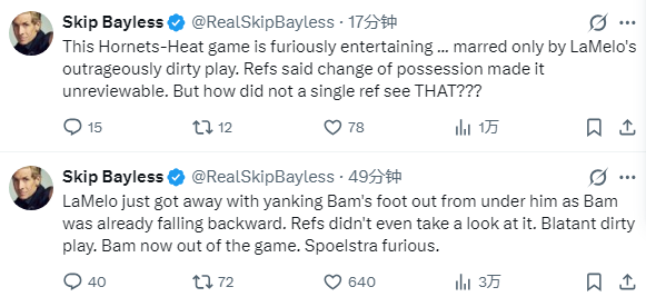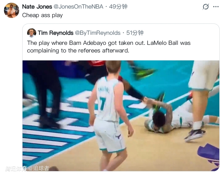 对于鲍尔故意拉拽弄伤阿德巴约,热火记者Tim Reynolds不满三球行为,尤其是在把阿德巴约弄出场后,三球还在跟裁判抱怨;NBA经纪人Nate Jones转发该动态并吐槽道:下三滥动作!