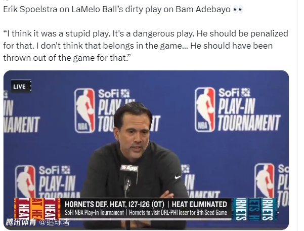 赛后谈到阿德巴约伤退,热火主教练斯波尔斯特拉表示:我认为这是一个愚蠢且危险的动作,他应该为此受到处罚,他应该被驱逐离场;显然,我们最好的球员因此受伤了。我并不是在找借口,黄蜂队打得很好,他们在关键时刻表现得非常出色。但我认为这种绊倒对手的小动作不应该出现在比赛中。