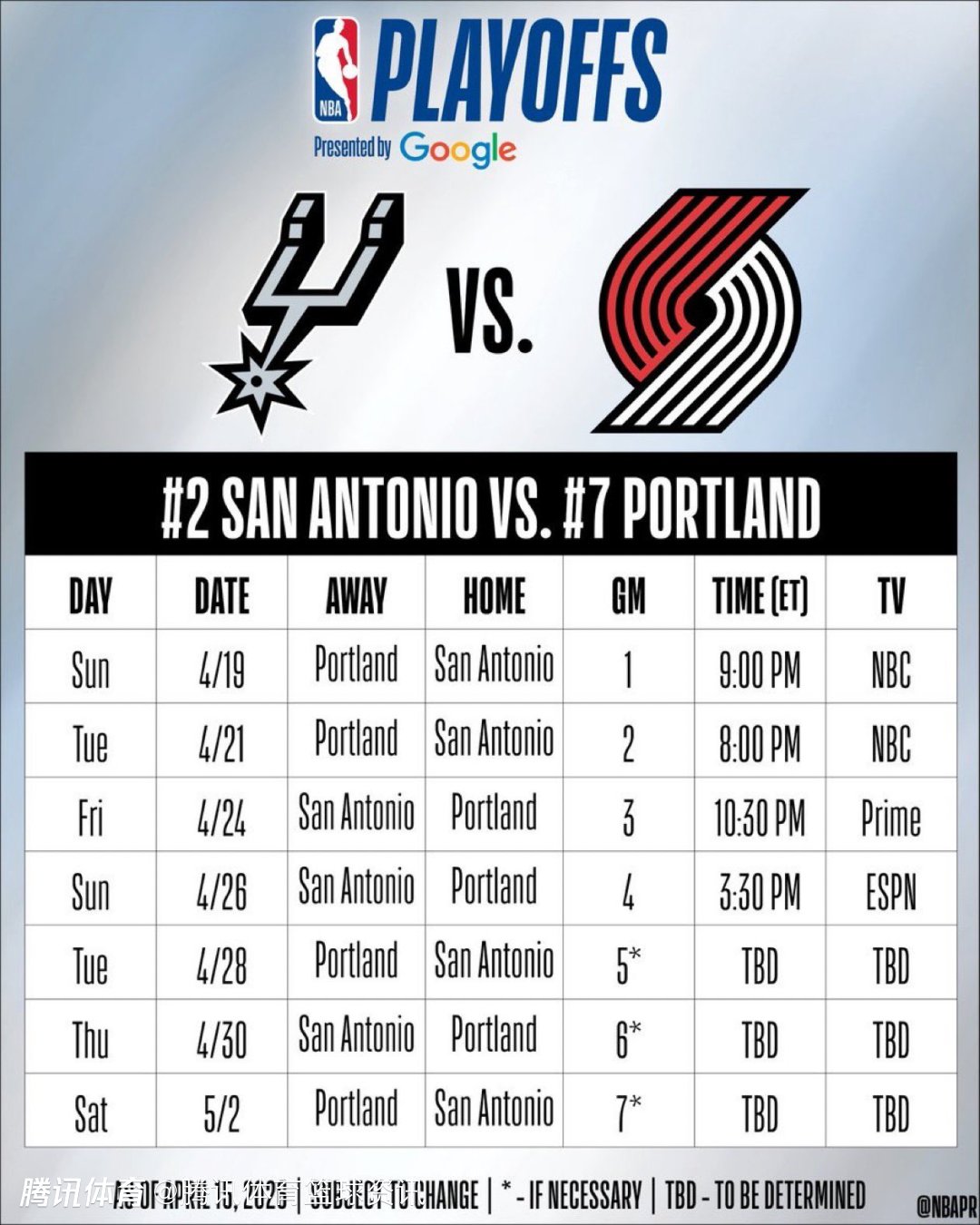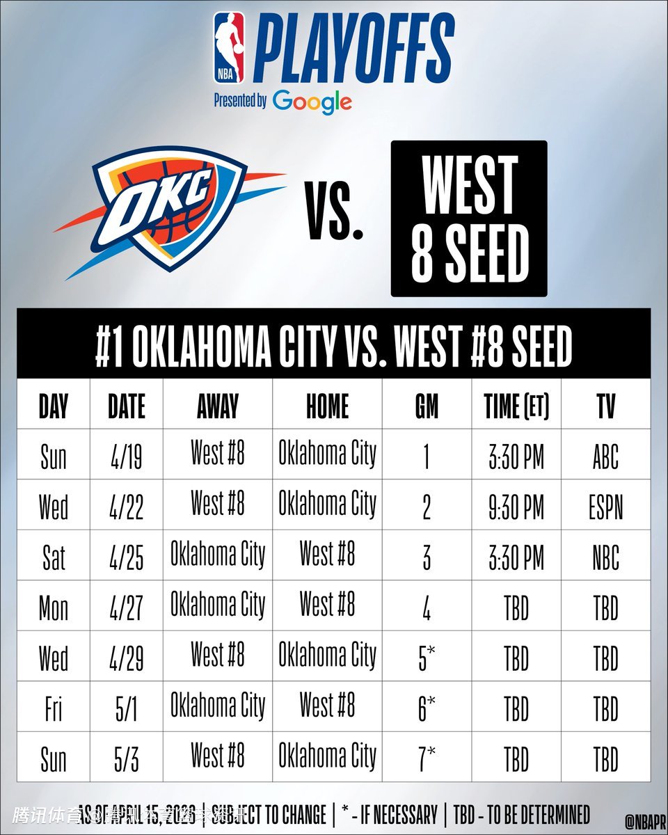 2026-04-15 13:40北京时间4月15日,NBA官方公布了西部首轮季后赛的全部赛程,具体情况如下(时间均为北京时间):
