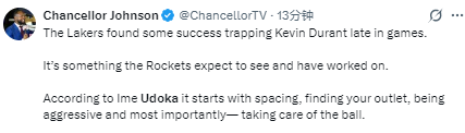 “另外,要拉开空间、做好出球接应;同时,有时候我们不像杜兰特那样有耐心。我们希望他能在对手完成包夹之前就发起进攻。杜兰特确实做到了摆脱包夹,突破了对方内线的封堵。”