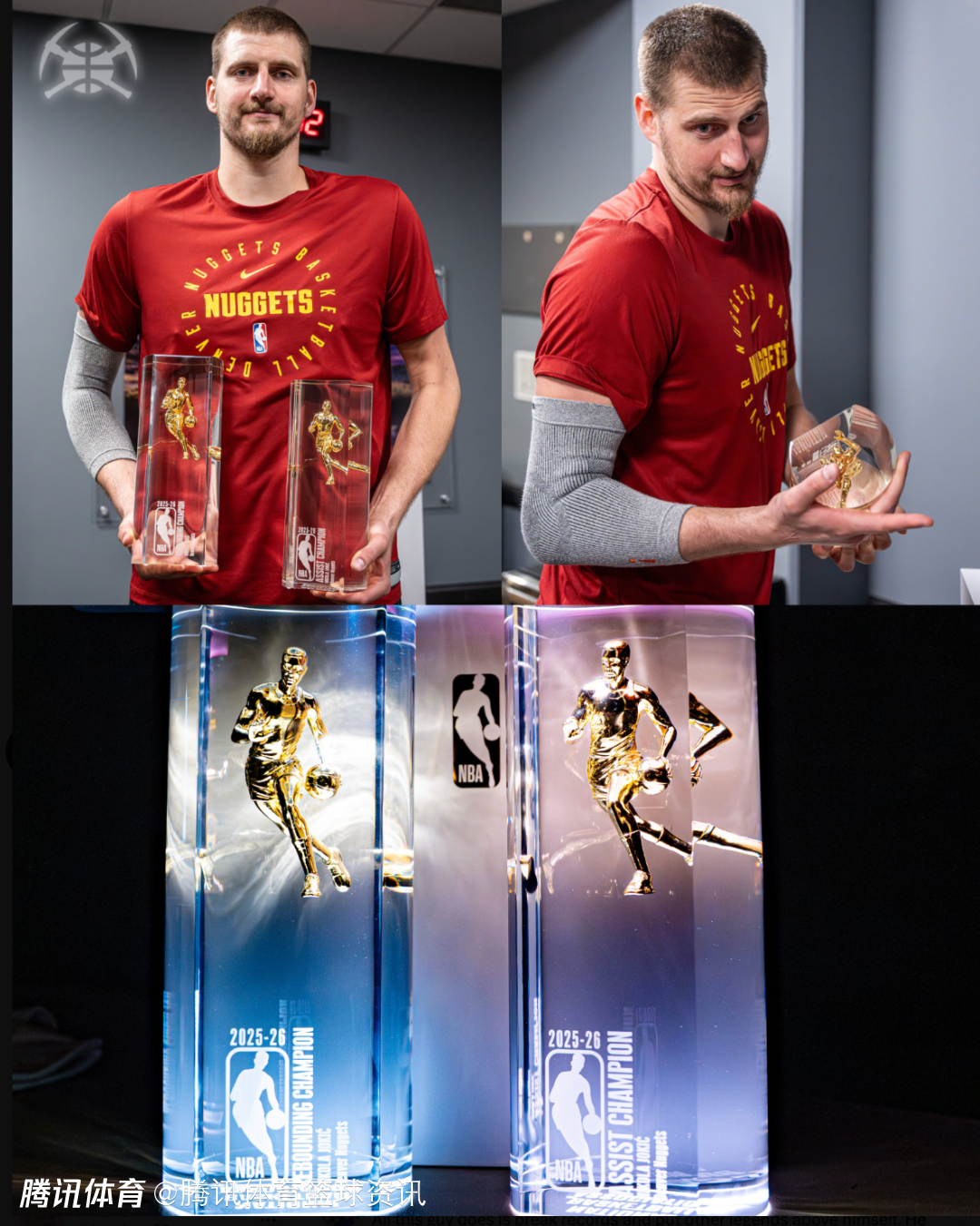 2026-04-16 09:20北京时间4月16日,掘金官方更新动态,晒出约基奇领到助攻王和篮板王奖杯的视频。