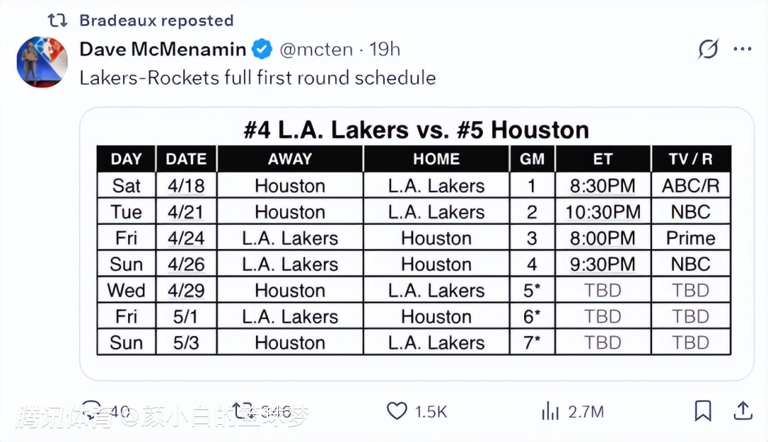火箭VS湖人的赛程已经全部出炉,4月18日开启第一场,4月21日第二场,4月24日第三场,第四场4月26日,第五场4月29日,第六场5月1日,第七场5月3日。