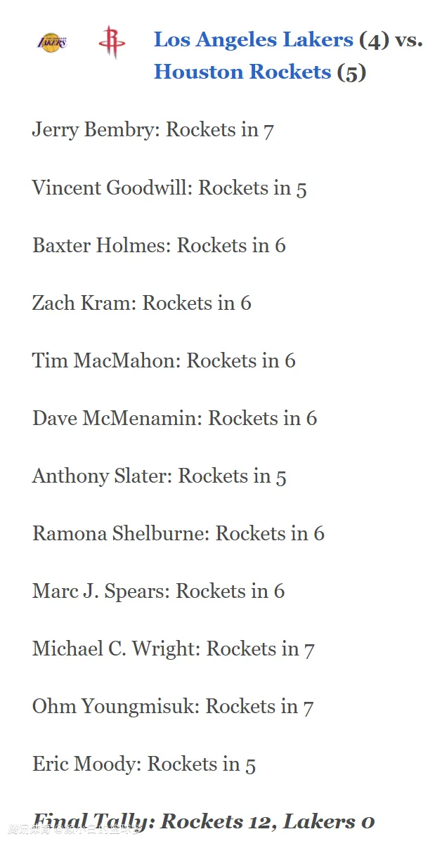 在4月14日季后赛对阵出炉时,就有数据媒体预测火箭淘汰湖人的概率超过80%,而在ESPN12位专家的预测中全都看好火箭晋级:三人看好4-1,六人看好4-2,三人看好4-3。