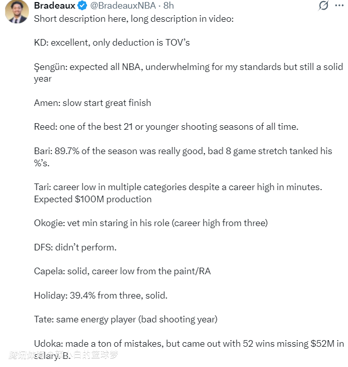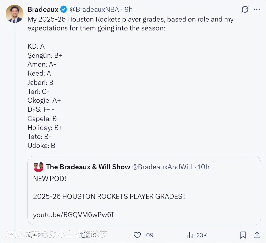 休媒Bradeaux对本赛季火箭队的球员进行评级: