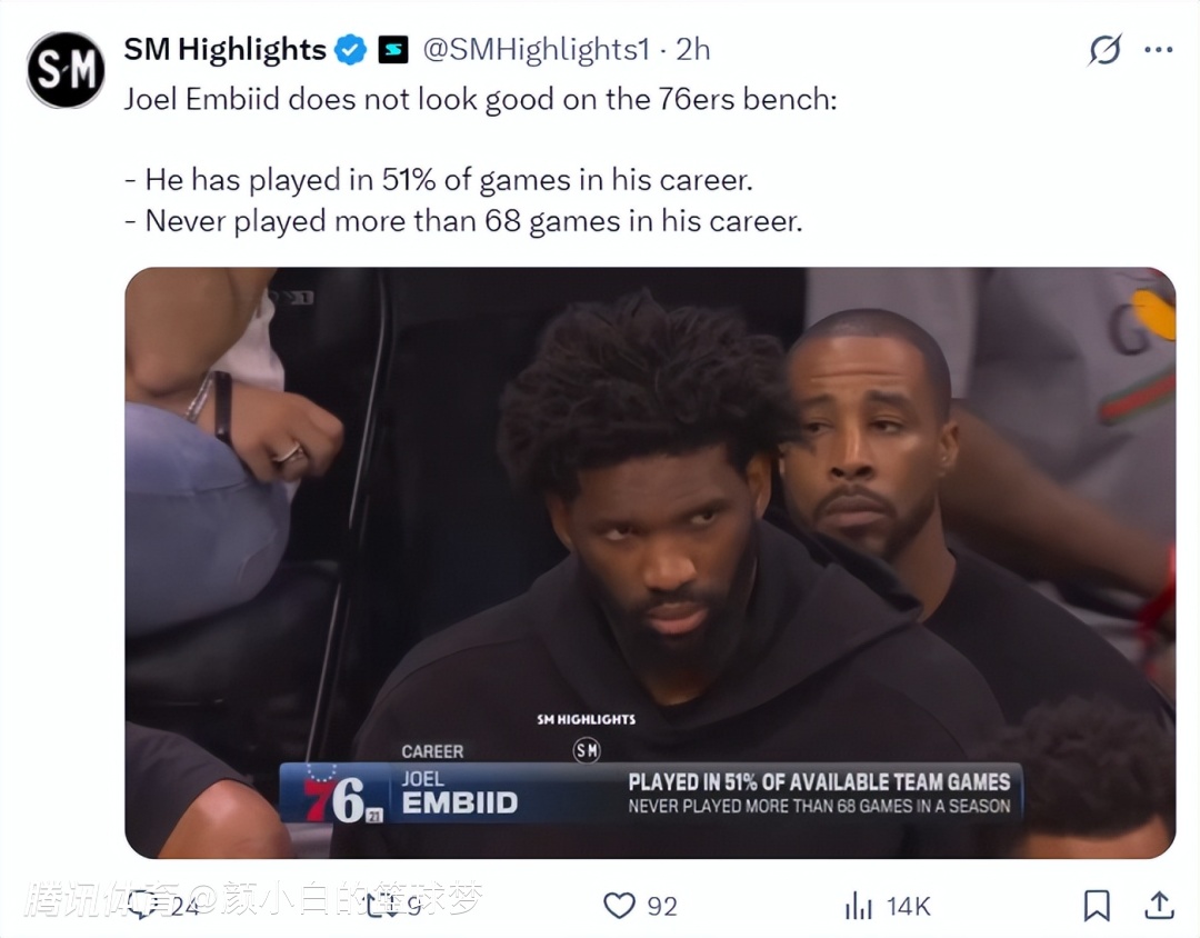 转播方也将镜头给到恩比德,他缺席了职业生涯超过51%的比赛,而且他职业生涯单赛季从未超过68场比赛,恩比德也全程黑脸,他看着马克西发挥。