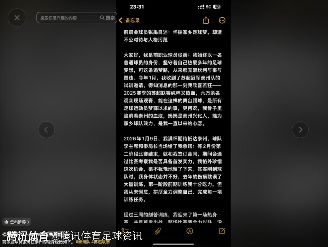 2026-04-16 11:00北京时间4月16日,前中超河北队球员张禹在社交媒体发布长文,控诉自己在苏超泰州队试训期间遭到不公正对待,包括主教练对其辱骂、造谣和恶意侮辱。