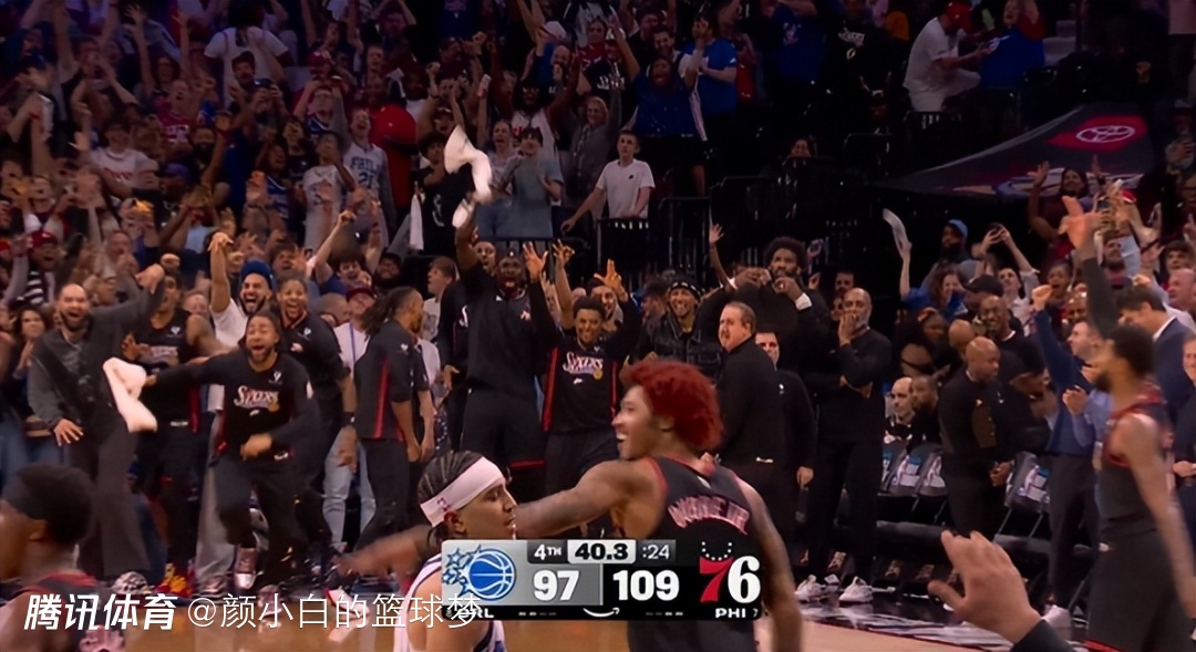 这一球命中后费城球馆都沸腾了,替补席的球员们都起身为庄神欢呼,乌度卡、埃奇库姆、马克西都已经开始庆祝了,因为他们知道这一球后费城已经锁定晋级了。