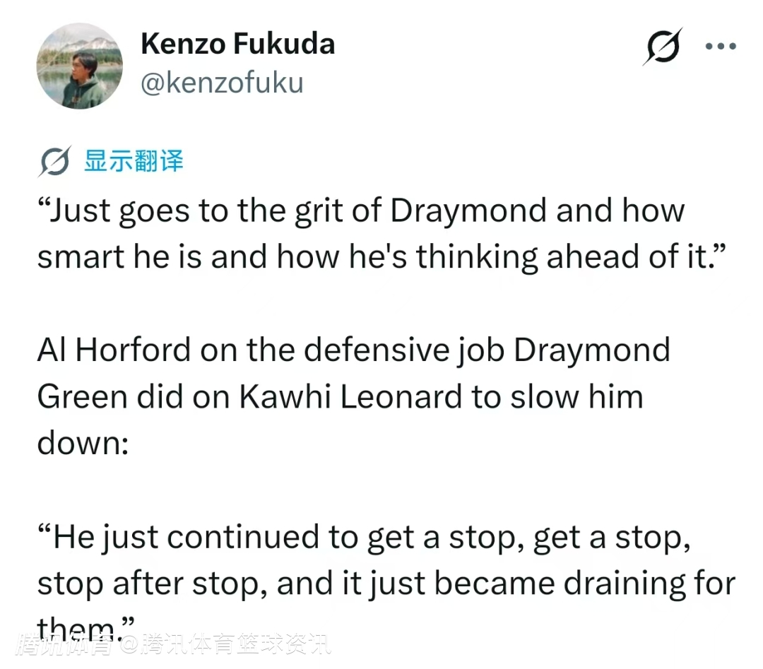 谈到追梦对莱昂纳德的成功限制时,霍福德表示:“这充分体现了追梦的强硬、高球商,以及他总能提前预判的能力。他一防一个准,连续成功防守,这让快船越打越疲惫。”