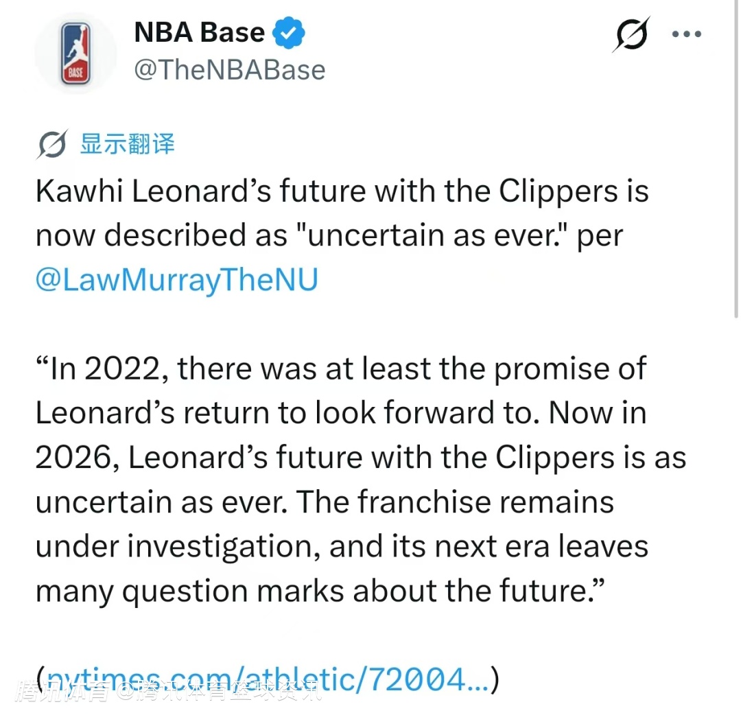 Law Murray认为莱昂纳德在快船的未来依旧充满不确定性。“2022年时,人们至少还能期待莱昂纳德回归。而到了2026年,他在快船的未来却变得前所未有的迷茫。球队仍在接受调查,下一个时代也留下了大量关于未来的问号。”