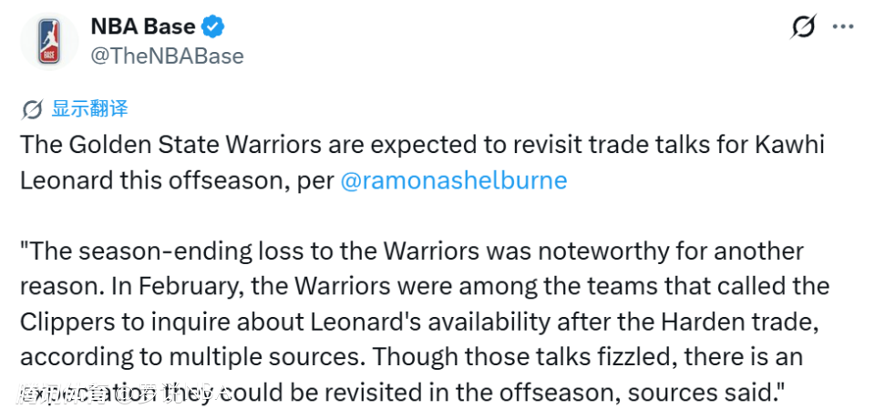 2026-04-16 18:20北京时间4月16日,据ESPN名记Shelburne报道,多方消息证实:早在2月哈登交易尘埃落定后,勇士就曾联系快船,询价莱昂纳德。虽然当时的谈判无疾而终,但消息人士透露,双方很可能在今年休赛期重启相关讨论。此前还有报道称,勇士今夏会追求小卡、字母哥和詹姆斯中的一位。