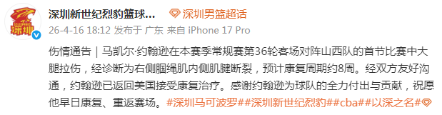 2026-04-16 21:30深圳男篮透露球队外援马凯尔-约翰逊因伤预计康复周期约8周。经双方友好沟通,约翰逊已经返回美国治疗。
