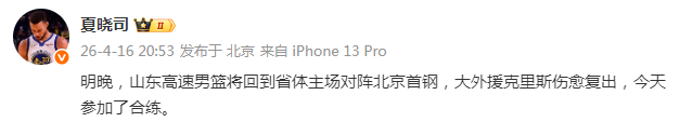 2026-04-16 21:40山东媒体人夏晓司透露,山东男篮外援克里斯将在明晚对阵北京队的比赛里复出。