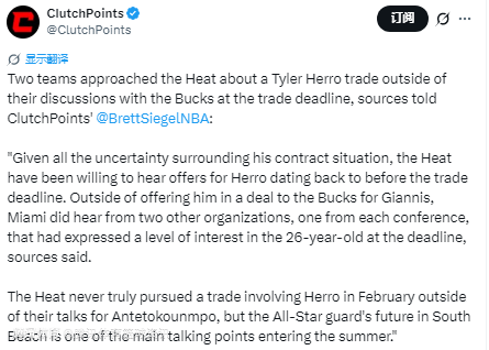 2026-04-16 23:00北京时间4月16日,据ClutchPoints记者Brett Siegel报道,消息人士透露,在交易截止日期间,除了与雄鹿的谈判之外,另有两支球队就希罗的交易事宜联系过热火。