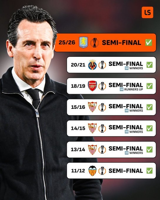 而这已经是维拉主帅埃梅里执教生涯第7次进入欧联杯四强,前6次进四强中,埃梅里带队4次夺欧联,可谓“欧联之王”,此次他将带队冲击个人欧联第5冠。