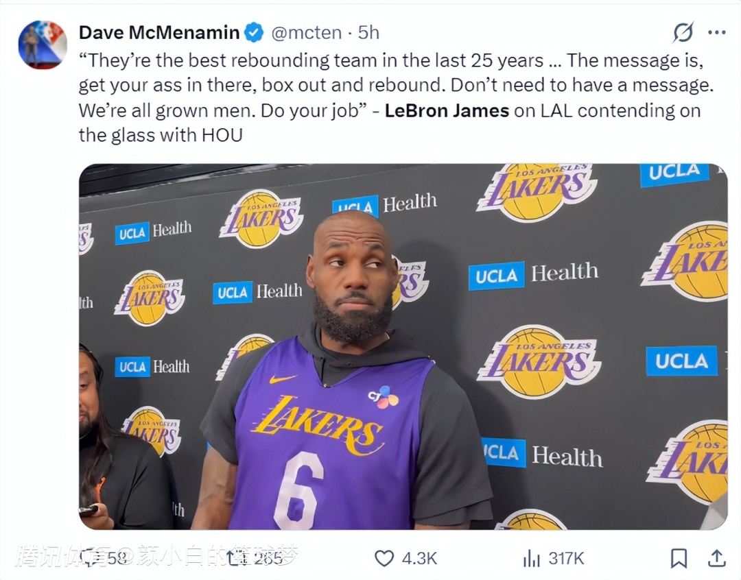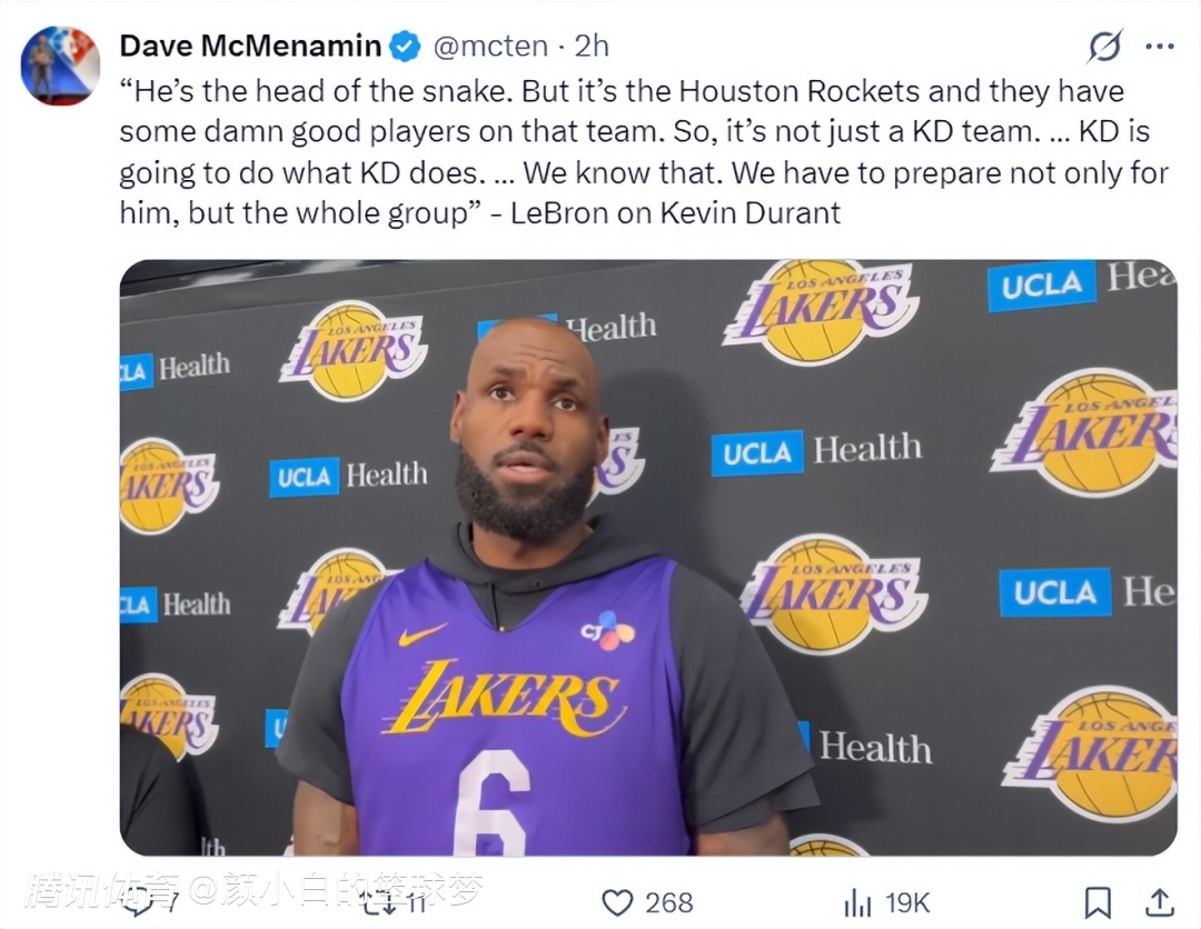 勒布朗还盛赞了37岁的杜兰特,他表示:KD是火箭的核心,但火箭队还有很多出色的球员,所以现在的火箭不是杜兰特去领导,KD会按照他一贯的方式去打球,我们都很清楚这一点,我们必须为这场比赛做好周详的准备。