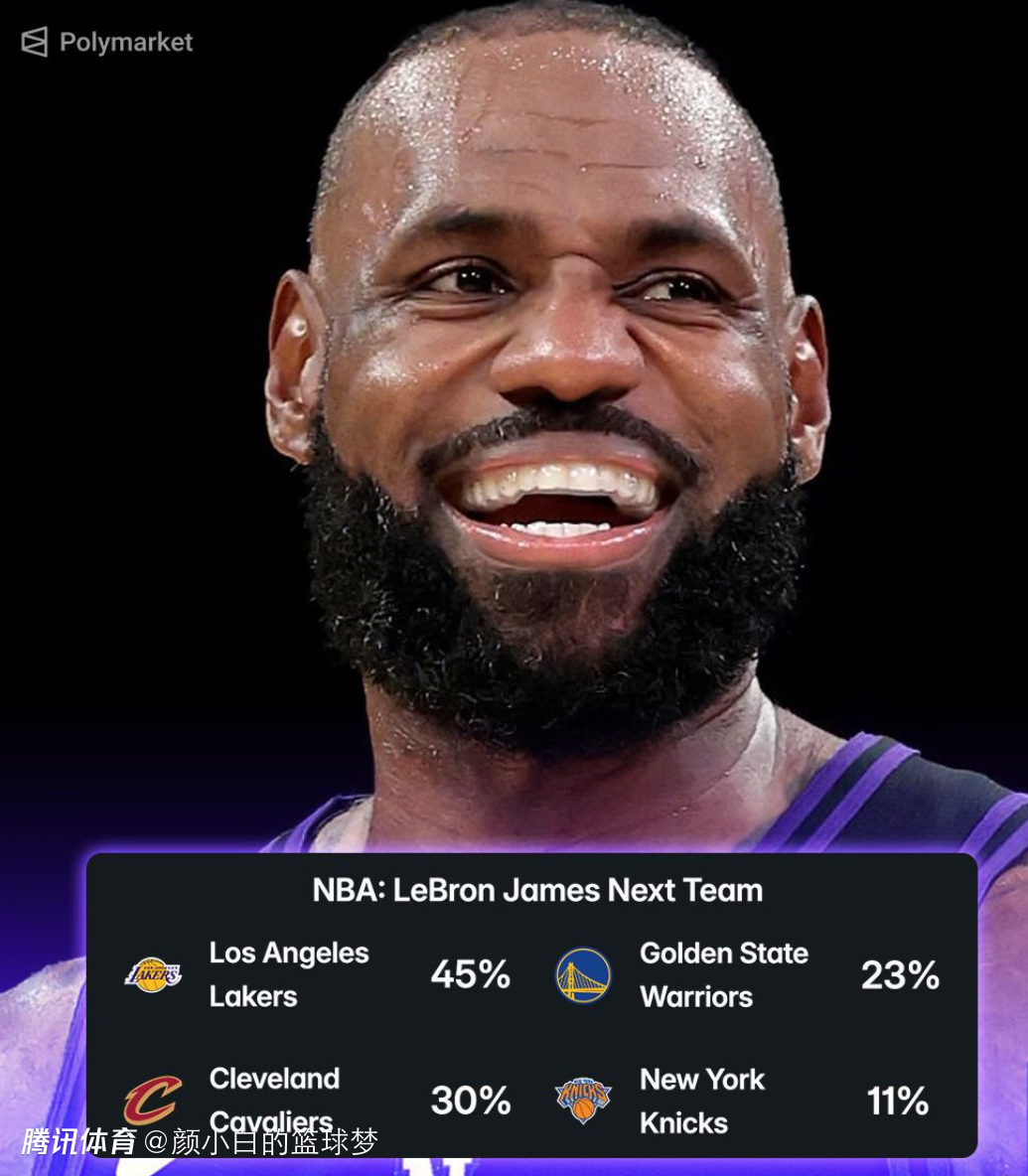 根据数据媒体的预测,勒布朗留守湖人概率45%,加盟勇士概率23%,加盟骑士概率30%,加盟尼克斯概率11%。