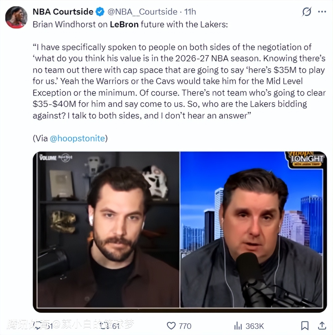 2026-04-17 10:00北京时间4月17日,ESPN记者布莱恩-文霍斯特在播客节目中谈到勒布朗-詹姆斯的未来,他表示我专门跟多支球队谈论过,勒布朗在26-27赛季的价值是多少?要知道没有哪支球队会给他3500万-4000万,所以湖人的竞争对手是谁?我没有听到答案,勇士队跟骑士队大概率只愿意为勒布朗提供中产/底薪合同。