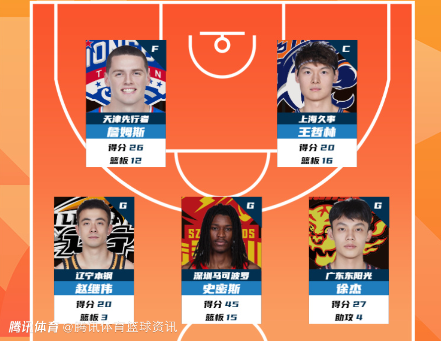 2026-04-17 10:00北京时间4月17日,CBA官方发布常规赛第39轮数据战报,来自天津荣钢篮球俱乐部 的詹姆斯(26分12篮板),上海久事大鲨鱼的王哲林(20分16篮板),辽宁沈阳三生飞豹的赵继伟(20分3篮板),深圳新世纪烈豹的史密斯(45分15篮板)和广东宏远的徐杰(27分4助攻)入选CBA联赛常规赛第39轮最佳阵容。
