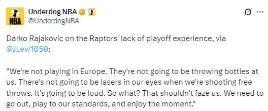 在谈到外界有人认为猛龙队缺乏经验时,拉亚科维奇表示:“我们又不是在欧洲打球。没人会朝我们扔瓶子,我们罚篮的时候也不会有人用激光笔晃眼睛。现场只会很吵而已,那又怎样?这不应该影响到我们。我们只管上场,打出自己的水准,好好享受这一刻。”