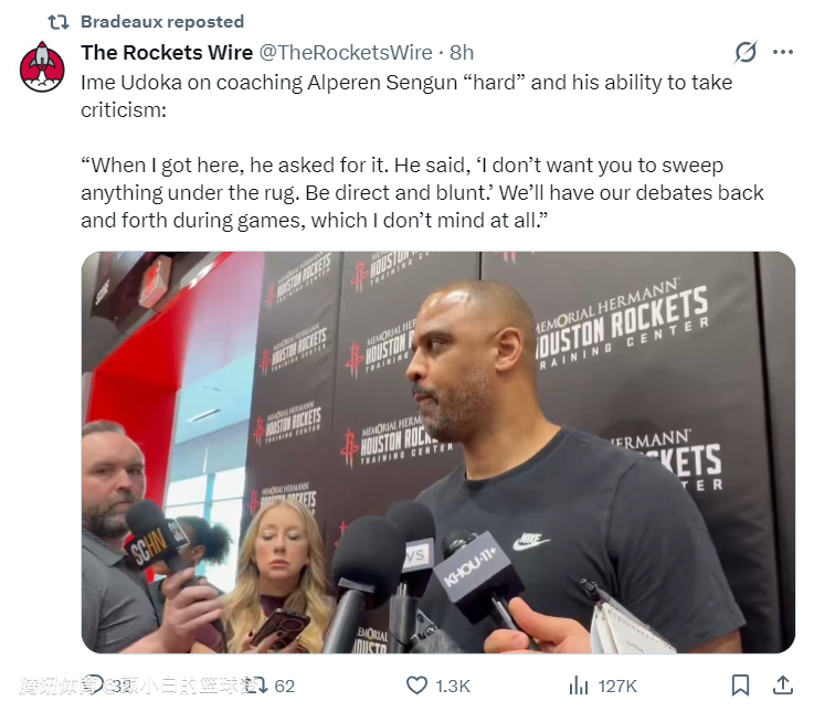 乌度卡还谈到近期对申京非常严厉,他说道:我刚来的时候申京自己要求我直接一点,不需要我把他的小毛病掩盖过去,在比赛中可以强硬的争论他不会介意这些东西。