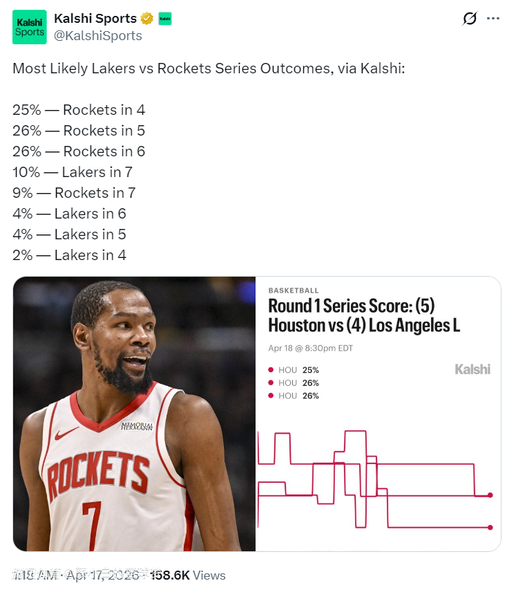 此前ESPN的12位专家一致认为这组首轮对决是火箭晋级,根据数据美媒Kalshi Sports写道,火箭4场晋级概率25%、火箭5场晋级概率26%、火箭6场晋级概率26%、火箭7场晋级概率9%。换言之火箭横扫湖人的概率比湖人所有的晋级概率加起来都高。