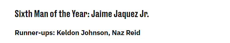 最佳第六人小哈梅-哈克斯,他本赛季在热火场均28.3分钟,拿到15.4分5篮板4.7助攻0.7抢断0.3盖帽,命中率50.7%,三分命中率31.7%,他击败了凯尔登、里德当选。