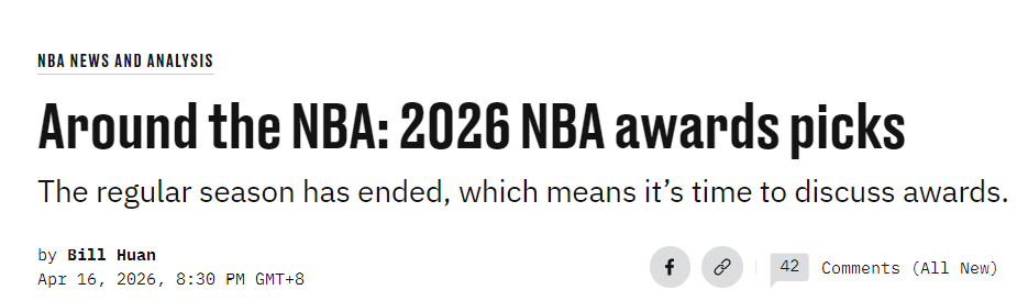 2026-04-17 11:50北京时间4月16日晚,美国媒体SB NATION预测了25-26赛季9奖项的得主,最终常规赛MVP还是被亚历山大收入囊中,换言之SGA成为连庄MVP,DPOY则是维克托-文班亚马,这个奖项舍他其谁。不过最佳新秀他们给了弗拉格没有给克努佩尔。