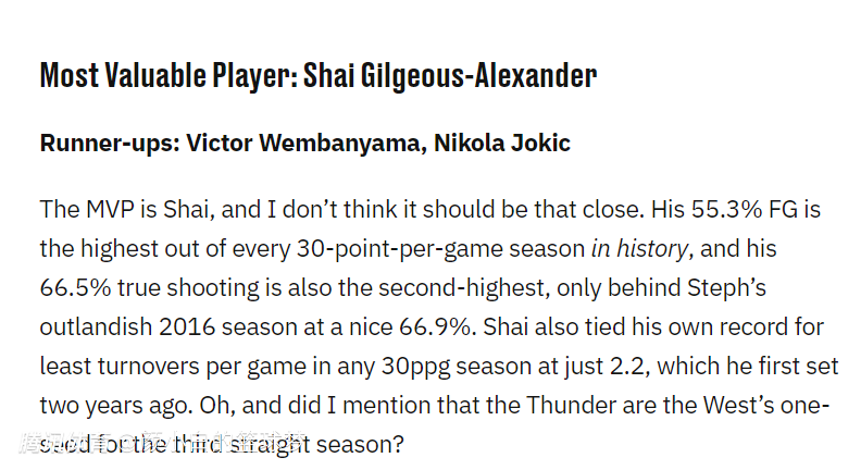 常规赛MVP亚历山大,真实命中率66.5%拿到30+是NBA历史第二人,我们觉得本赛季他蝉联MVP是必然,甚至没有人该接近他,他连续两个赛季帮助雷霆至少拿下64+胜场数。